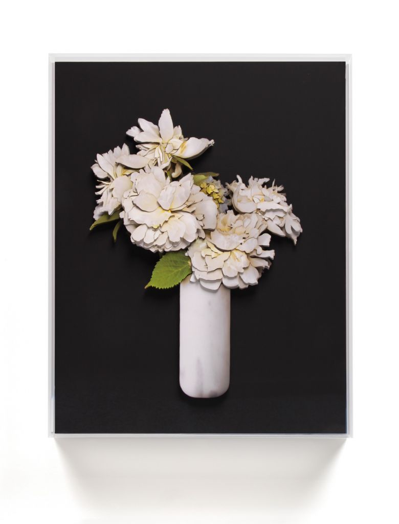 White Peonies On Black, 2025, 22" x 28" x 3", laser-cut archival pigment prints, archival foamcore and adhesive.